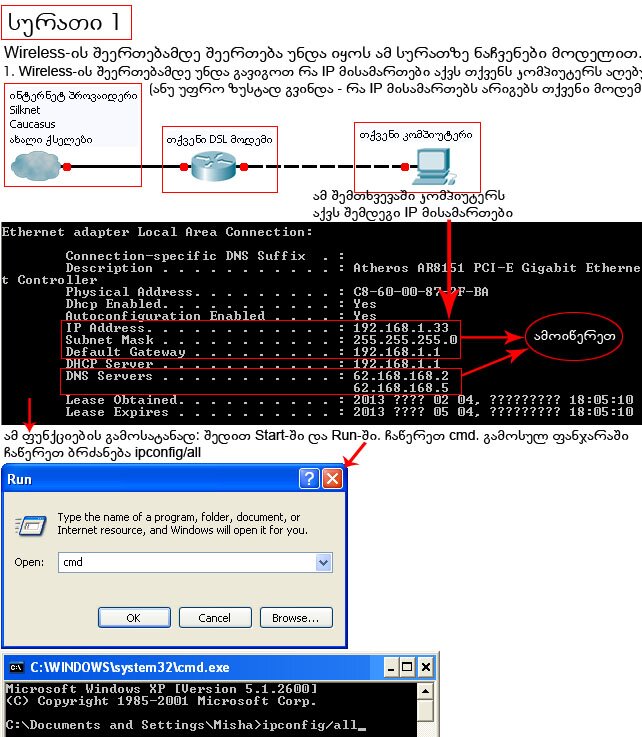 პირველ რიგში უნდა გავიგოთ რა IP მისამართებს არიგებს თქვენი მოდემი თქვენს ქსელში. ანუ თქვენს კომპიუტერს რა IP და DNS მისამართები მიანიჭა მოდემმა. ამისათვის უნდა გახსნათ Start-ი და Run-ი. ჩაწერეთ ბრძანება cmd. გამოსულ ფანჯარაში ჩაწერეთ ბძანება ipconfig/all. გამოგიტანთ სრულ ჩამონათვალს. ამოიწერეთ. ეს მისამართები უნდა გაეწეროს Wireless როუტერს. დაწვრილებით იხილეთ სურათი 1.