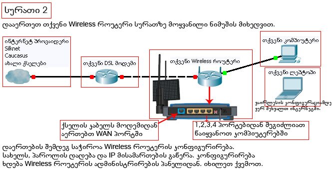 აქ მოყვანილია ნიმუში, თუ როგორ დავუკავშიროთ Wireless როუტერი: სილქნეტის (DSL და ბოჭკოვანი), ახალი ქსელების და კავკასუსის (DSL) ინტერნეტ მოდემებს.