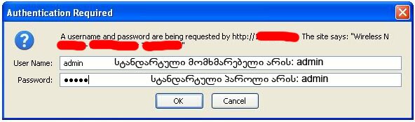 გახსენით ნებისმიერი ბრაუზერი (მაგ: Opera, Mozila Firefox, Google Chrome, Internet Explorer) და მისამართების ზოლში აკრიფეთ Wireless როუტერის IP მისამართი მაგ: 192.168.0.1 და Enter. თუ ყველაფერი წესის მიხედვით გააკეთეთ როუტერი მოგთხოვთ მომხმარებელს და პაროლს. სტანდარტული (ქარხნულად) მომხმარებელი და პაროლი არის: admin. დაწვრილებით იხილეთ სურათებზე.