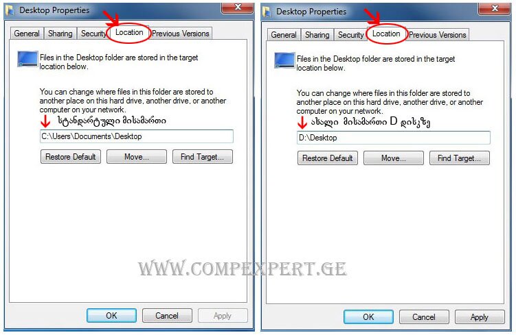 2. გახსნილ ფანჯარაში გადადით განყოფილება Location-ში და სტანდარტული მისამართი C:\users\მომხმარებლის სახელი\Desktop-ი შეცვალეთ ახალი მისამართით: D:\Desktop. შემდეგ დააწექით OK-ს. იხილეთ სურათი: