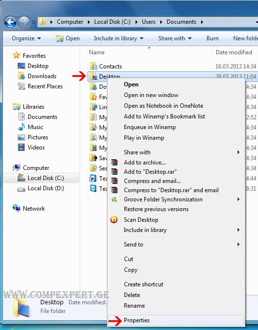 ამ შემთხვევაში სურათზე არსებულ მომხმარებელს ჰქვია Documents. თქვენს კომპიუტერში სხვა სახელი ერქმევა, შესაბამისად იპოვეთ ის მომხმარებელი რაც ვინდოუსის დაყენების დროს დაარქვეს. შემდეგ იპოვეთ Desktop - პაპკა. დააკლიკეთ მაუსის მარჯვენა ღილაკით და შედით Properties-ში. იხილეთ სურათზე: