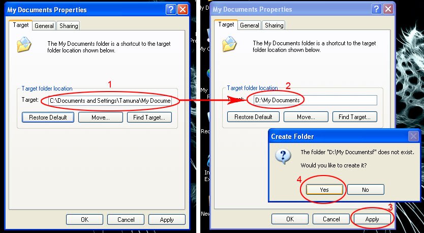 2. გამოსულ ფანჯარაში Target განყოფილებაში მიუთითეთ D:\My Documents. დააწექით Apply და შემდეგ Yes. მოხდება ფაილების D დისკზე კოპირება. დაწვრილებით ნახეთ სურათზე: